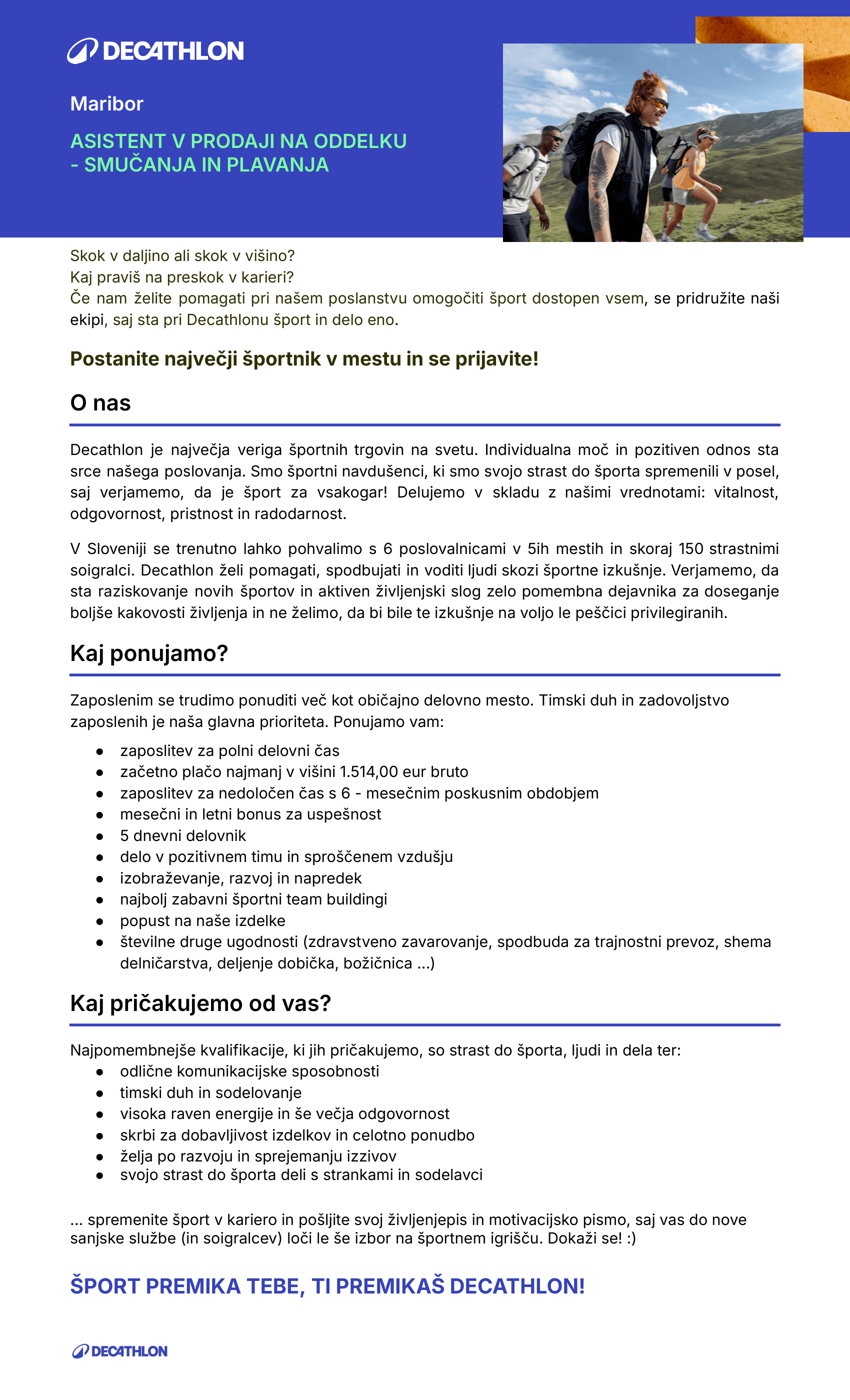 Dostop do vaših osebnih podatkov imajo le zaposleni pri podjetju Decathlon, ki sodelujejo pri postopku izbire. Vaši osebni podatki se bodo prenesli v podjetje Adopto Tech Ltd. Z namenom koriščenja aplikacije Talentlyft.