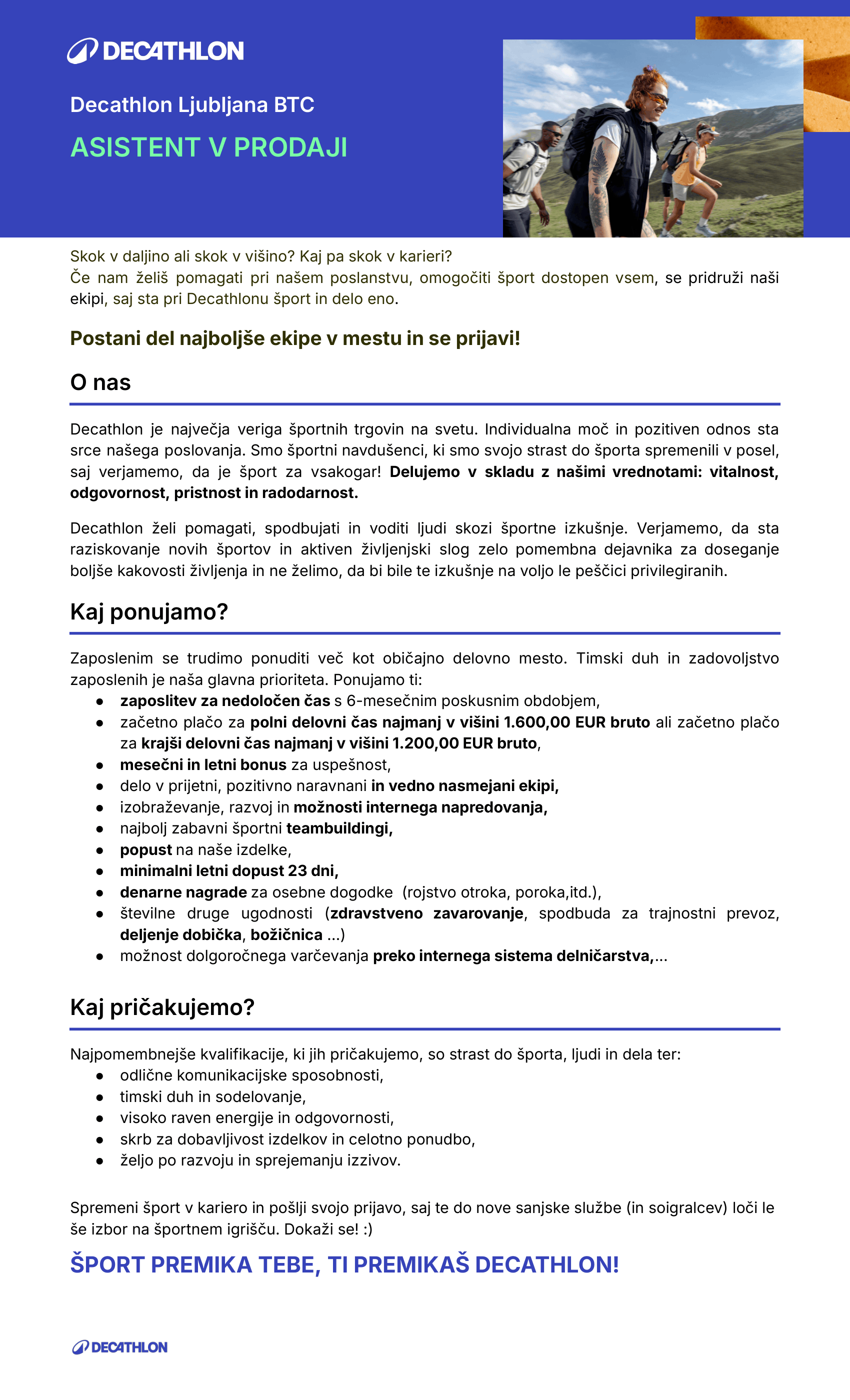 Dostop do vaših osebnih podatkov imajo le zaposleni pri podjetju Decathlon, ki sodelujejo pri postopku izbire. Vaši osebni podatki se bodo prenesli v podjetje Adopto Tech Ltd. Z namenom koriščenja aplikacije Talentlyft.