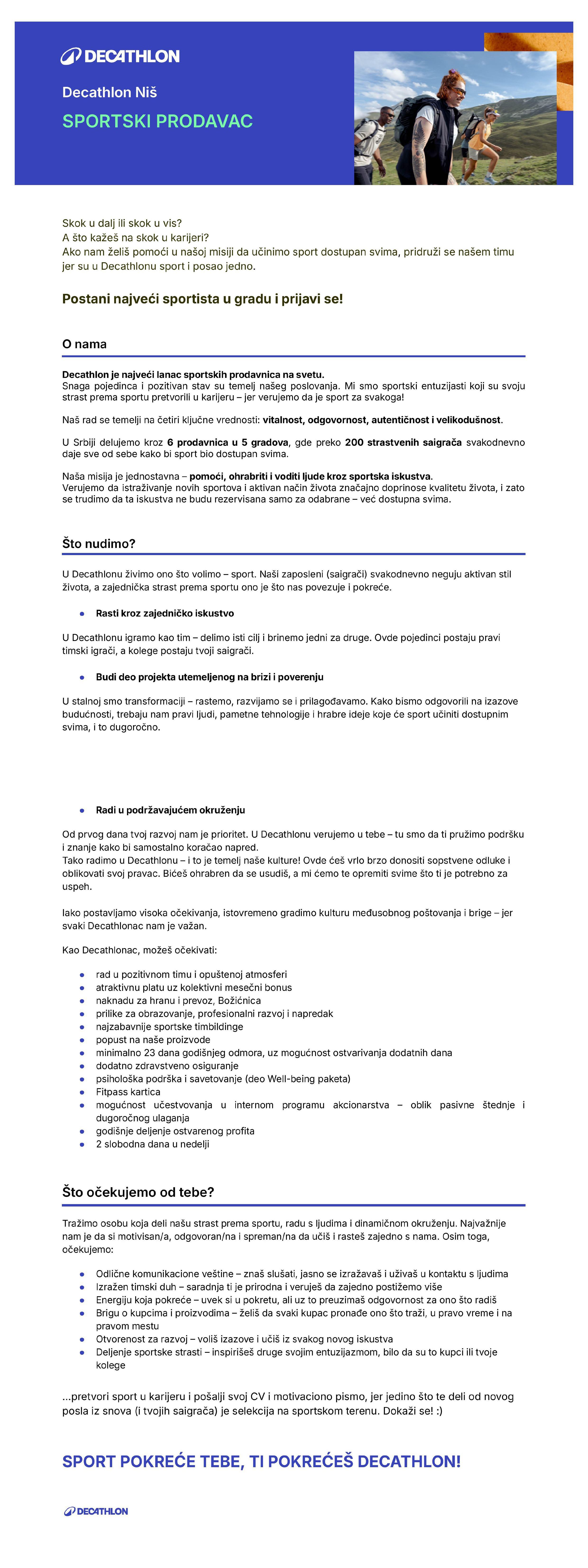 Pristup vašim ličnim podacima je ograničen na zaposlenike kompanije Decathlon koji učestvuju u procesu selekcije. Vaši osobni podaci prenosit će se društvu Adopto Tech Ltd. u svrhu korištenja aplikacijom TalentLyft.