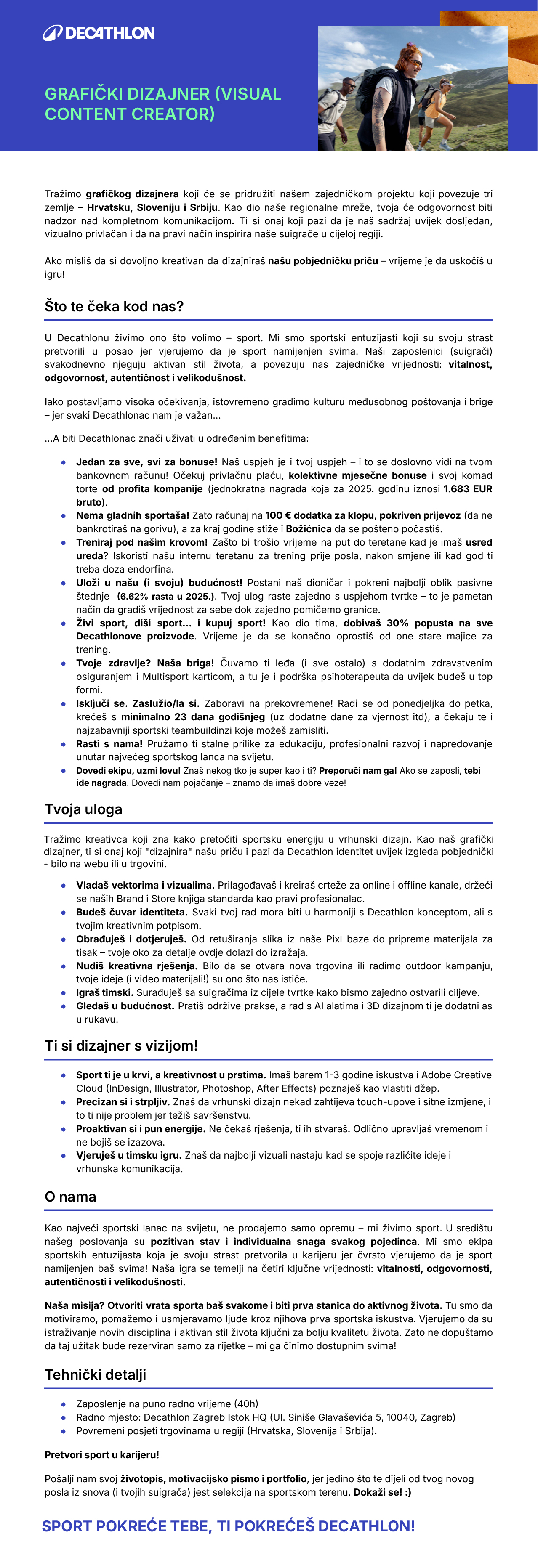 Pristup vašim ličnim podacima je ograničen na zaposlenike kompanije Decathlon koji učestvuju u procesu selekcije. Vaši osobni podaci prenosit će se društvu Adopto Tech Ltd. u svrhu korištenja aplikacijom TalentLyft.