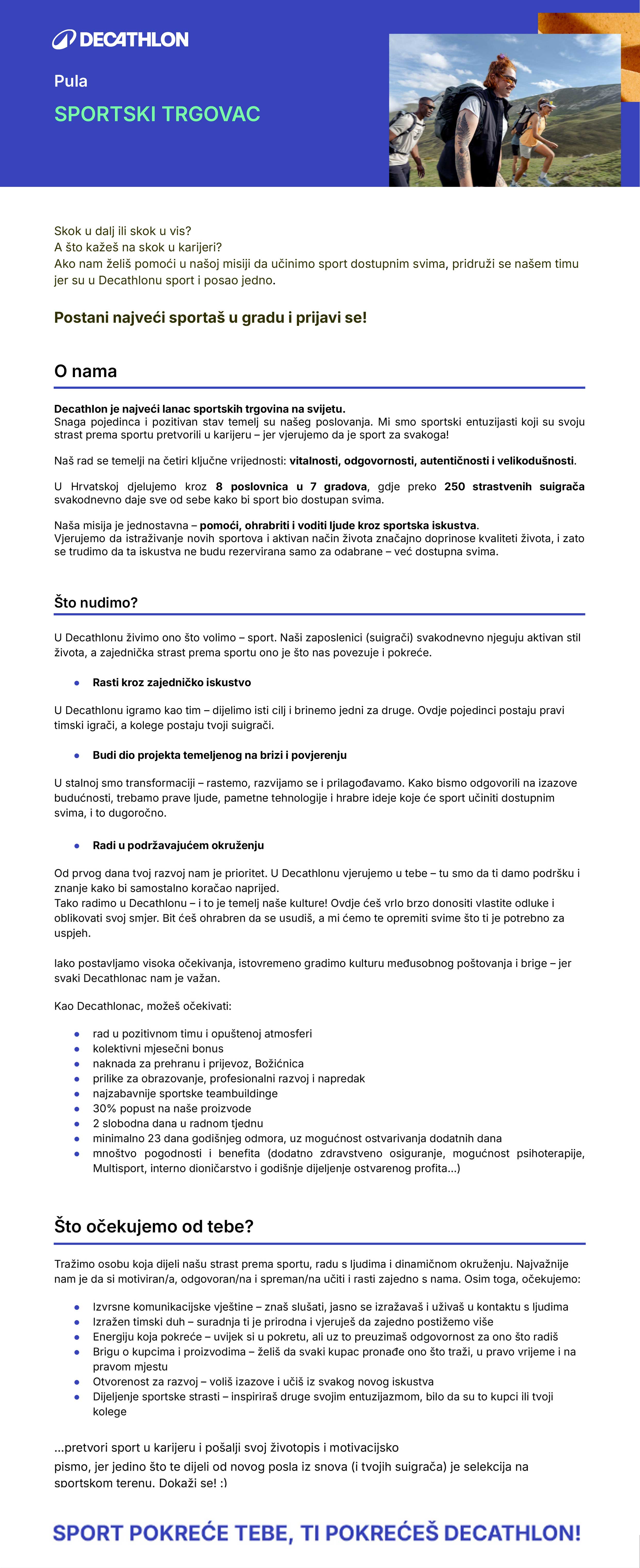 Samo zaposlenici Decathlona koji sudjeluju u postupku odabira imaju pristup vašim osobnim podacima.